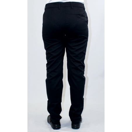 Le pantalon de cuisine Ecume de la marque Robur dispose d'une ceinture avant passant fermée par bouton, une braguette fermée par zip, deux poches italiennes, une poche dans le dos, et des pinces au dos.