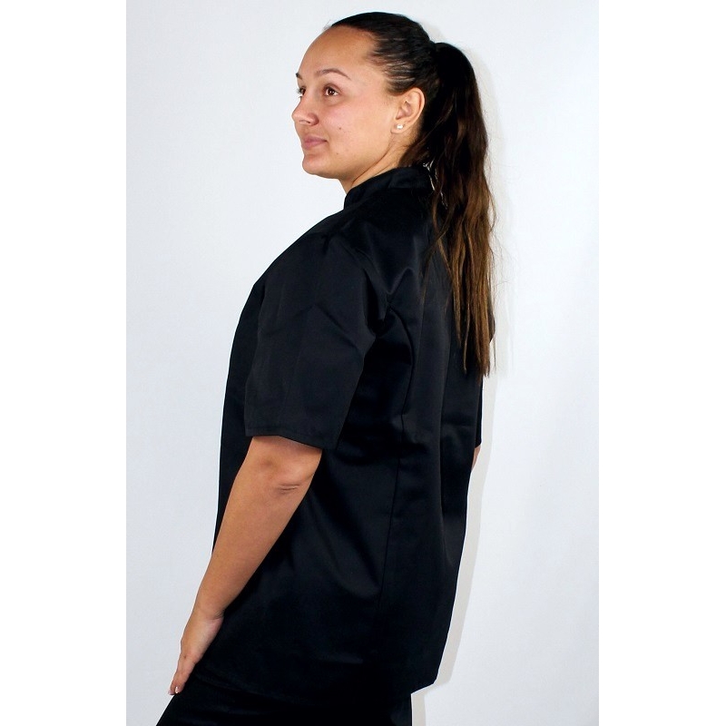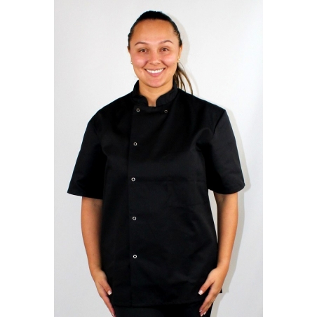 La veste de cuisine Inox manches courtes de la marque Robur dispose d'un col officier, d'une fermeture asymétrique avec boutons pressions, et une poche poitrine intérieure côté coeur.