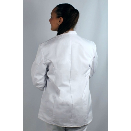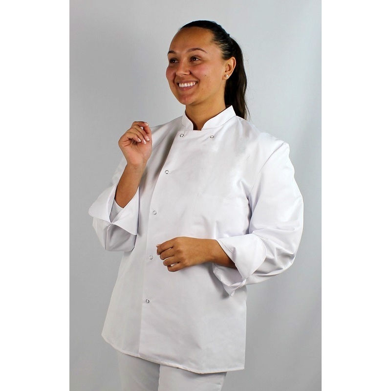 Les manches longues de la veste offrent une protection contre les éclaboussures. Elle est équipée d'une fermeture à boutons pression sur le devant, ce qui facilite son enfilage et son retrait rapides. De plus, elle comporte des poches pratiques pour ranger des objets essentiels tels que des stylos, des carnets de commandes, des thermomètres, etc., afin que vous ayez vos outils à portée de main pendant la préparation des plats.